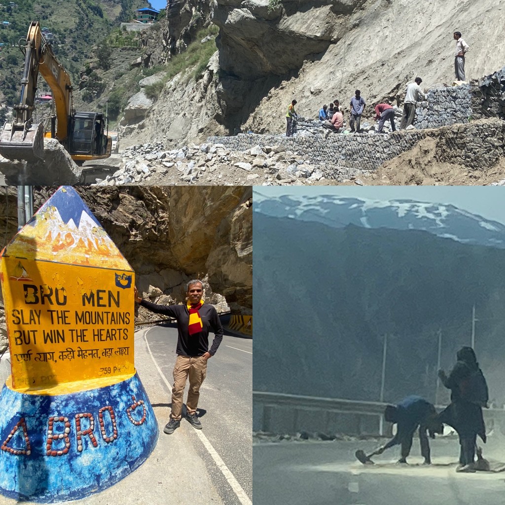 All through our journey, we saw them—not as a single force, but as countless individual souls: Village men clearing loose rocks by hand, Earthmovers restoring broken bridges, Cranes parked on impossible cliffs, Women and men waving us on through dust and rockfall, And the signboards—oh those BRO signboards—