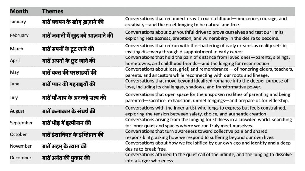 हम अगले बारह महीने इन बातों के ज़रिए अपने दिलों के दरवाज़े खोलेंगे। कभी ये बातें हमें जीवन के हर पड़ाव पर आज़ाद होकर जीने की प्रेरणा दें, तो शायद कभी ये बातें हम जहाँ कहीं भी हैं वहाँ स्वयं और दूसरों के साथ सच्चे संवाद के लिए प्रेरित करेंगी।
