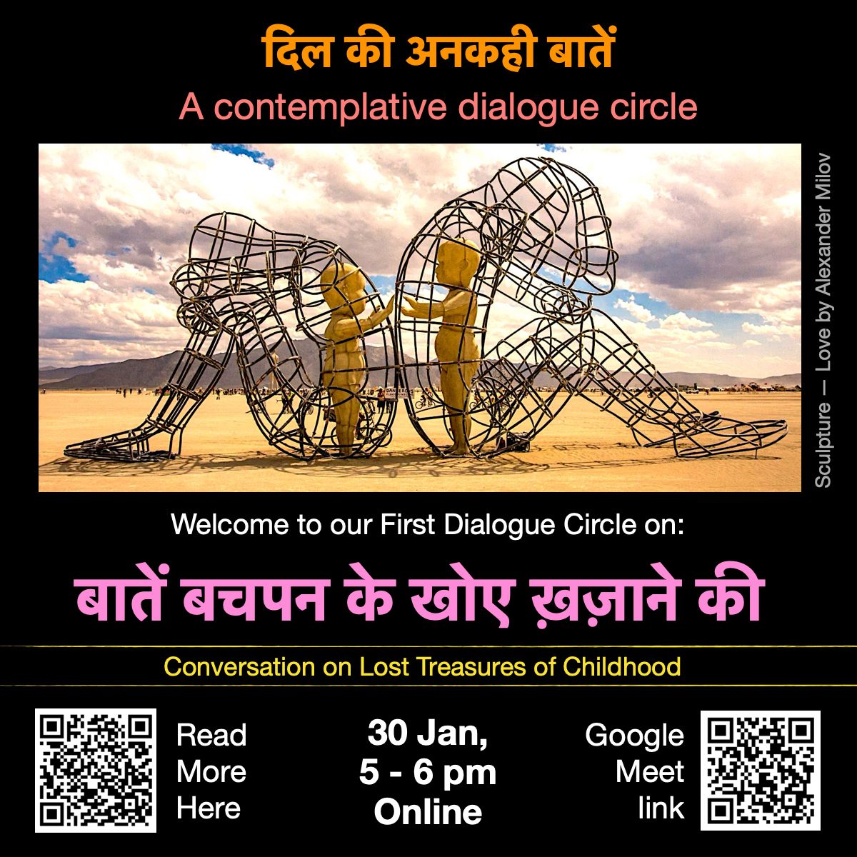 First Dialogue Circle is on Friday, शुक्रवार, 30 जनवरी , शाम 5:00–6:00 बजे on “बातें बचपन के खोए ख़ज़ाने की” (Conversation on Lost Treasures of Childhood)